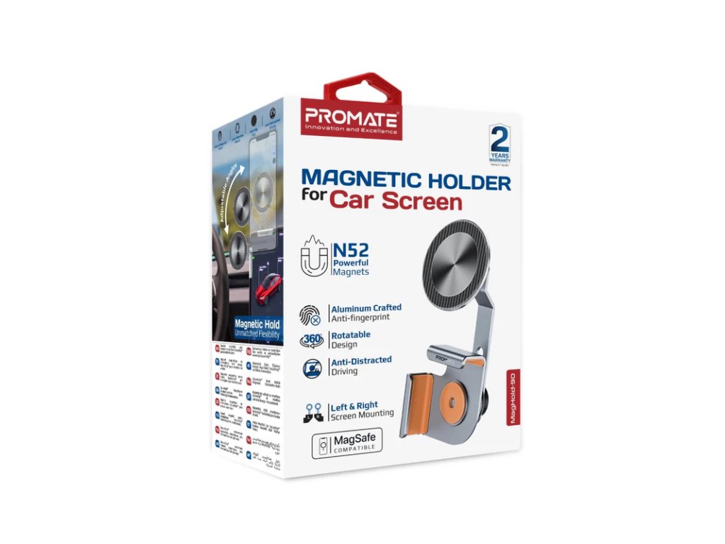 MagHold-90 od Promate zlepšuje zážitek z jízdy díky držáku telefonu SecureGrip™ Car Monitor, který nabízí bezkonkurenční stabilitu a snadné použití. Tento špičkový produkt na trhu je vybaven magnety N52 vojenské třídy a kompatibilitou MagSafe, která zajišťuje, že váš telefon zůstane pevně na svém místě na monitorech auta v rozsahu od 7 do 14,6 mm. Nastavení rotace o 360° a vysoká teleskopická schopnost umožňují plynulé změny úhlu a zvyšují viditelnost bez překážek na monitoru. Jeho bezkolébkový design v kombinaci s držáky chráněnými silikonem pro ochranu proti otřesům a extra stabilitu udrží váš telefon i monitor v autě v bezpečí. MagHold-90, vyrobený z odolných materiálů, kombinuje inovace a praktičnost pro bezpečnější a pohodlnější jízdu. Jezděte s jistotou, že váš telefon je bezpečný a snadno dostupný.