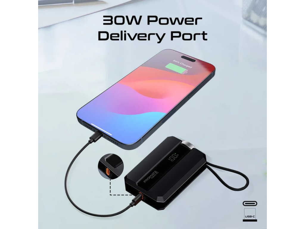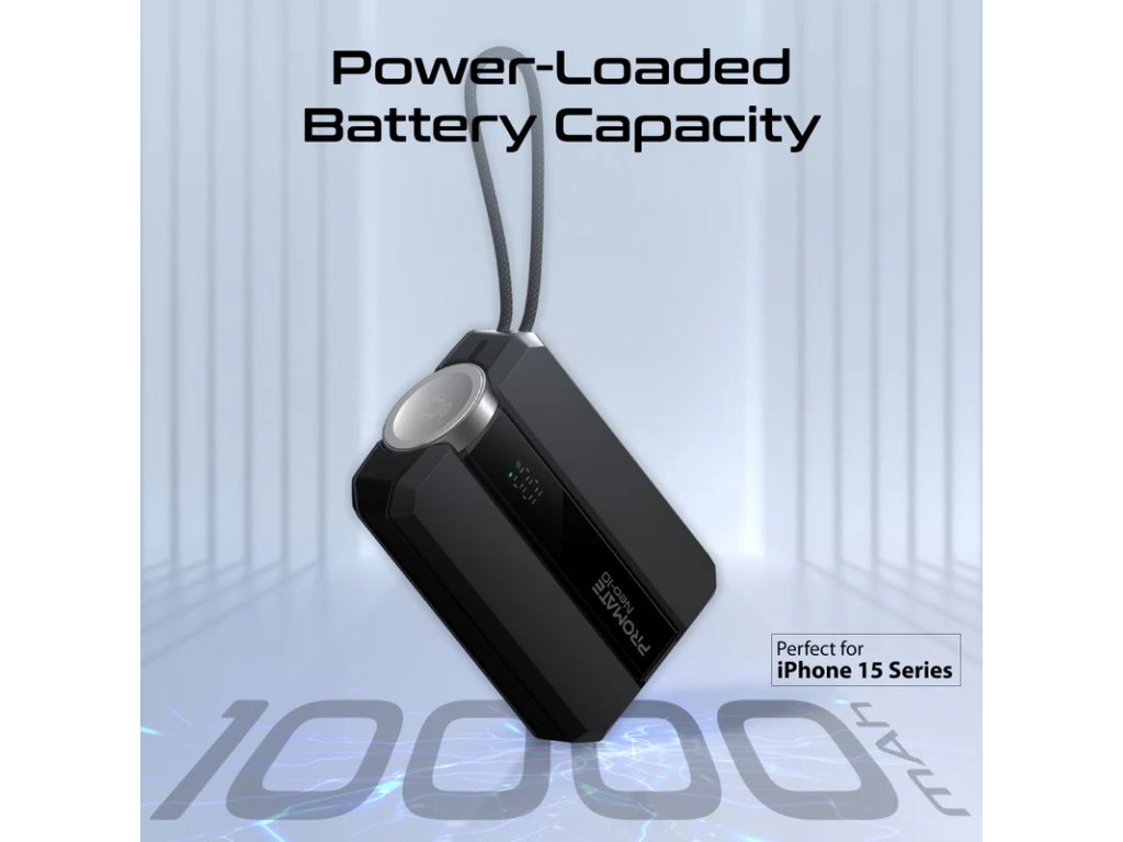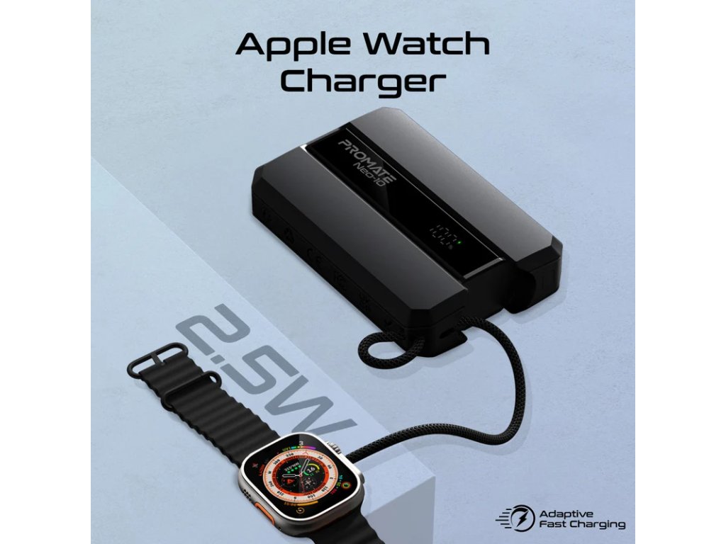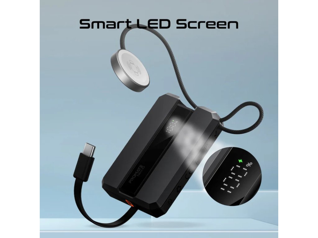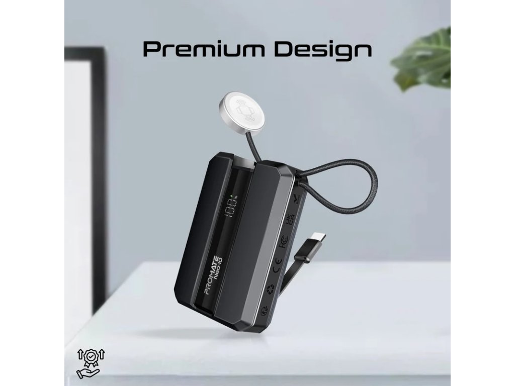 PROMATE Neo 10 powerbanka pro Apple Watch, s USB-C a vestavěným USB-C kabelem, PD, 10 000 mAh, 30 W, černá
