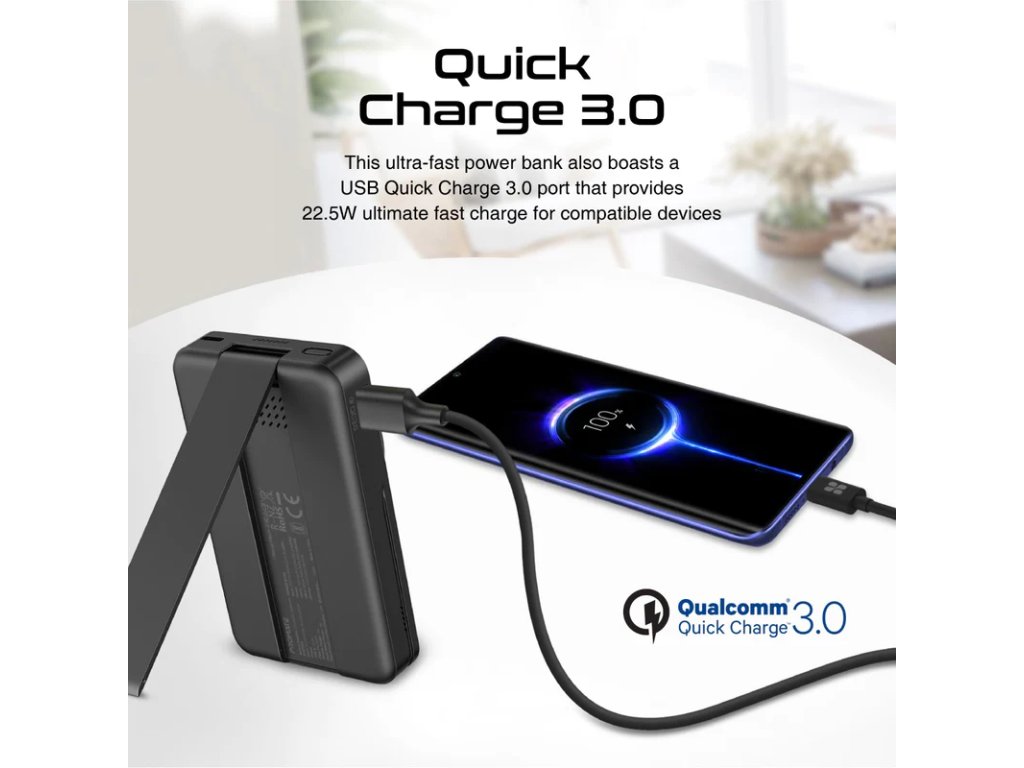 USB-A výstup: 5V/4,5A, 5V/3A, 9V/2A, 12V/1,5A (22,5W) QC 3.0