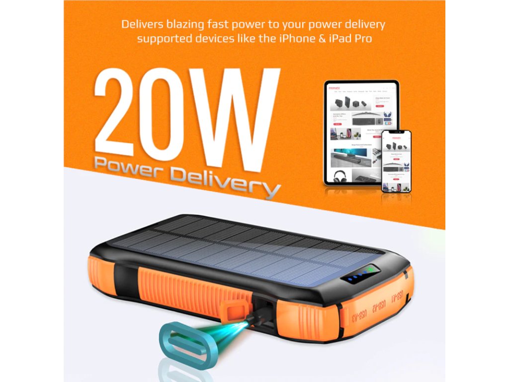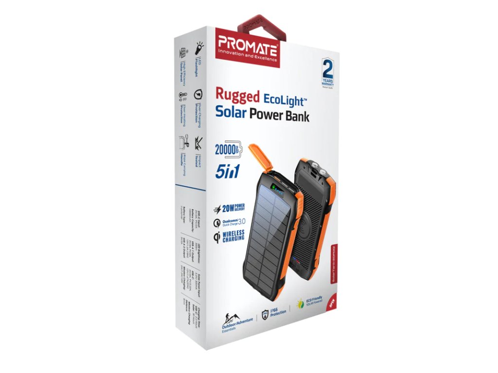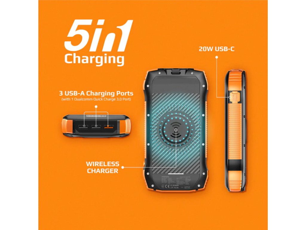 PROMATE SolarTank-20PDQi solární powerbanka 5v1, 20 000 mAh, 3x USB-A, USB-C, Qi, LED